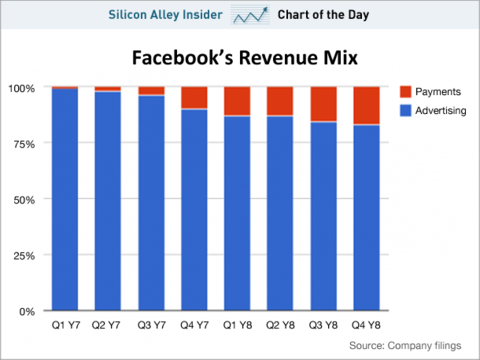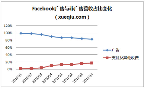 广告是 Facebook 的主要收入来源。2011年全年,广告为 Facebook 贡献了85%的营收,2011年四季度营收同比增长了55%,主要得益于广告营收的44%增长(9.43亿美元)。2011年四季度,得益于活跃用户数量增长以及用户使用率提高,Facebook 上的广告数量比去年同期增长了16%,平均广告价格则比一年前增长了24%。另外,据招股书披露,截至2011年12月,Facebook有50%的月度活跃用户(MAU)来自移动端,其中38%通过智能手机上的应用访问。但目前 Facebook还没有开始将广告系统移植到移动端。