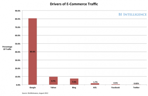 RichRelevance 调查显示,谷歌为(美国)电商网站带去了80%流量,相比之下从Facebook 仅贡献了0.5%的流量,但2012年 Facebook 给电商带去的流量比例比2011年增长了92%。再以亚马逊为例,comScore 数据显示,2010-2011年谷歌为亚马逊带去的流量基本一直维持在20%的水平,而来自 Facebook 的流量则从2010年的2%大举提升至2011年的8%。