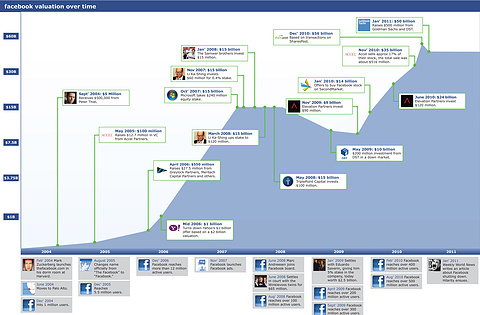 上图展示的是 Facebook 估值变化的过程。可以看出,早在IPO前, Facebook 在非公开市场获得的估值已经不低。过去一段时间,美国资本市场出现的一个现象是,很多科技公司在正式公开交易前就已被赋予非常高的估值。去年上市的一批公司(如$Groupon(GRPN)$、$Zynga(ZNGA)$、$潘多拉网络电台(P)$)的情况证明了这一点。大量在越来越广泛消费领域的创新,让很多公司在IPO前就为人熟知,其受欢迎程度助长了投资者对其的高估值,但从另一方面来说也让市场提早“消费”了部分上涨动力(momentum),这从一定程度上影响了通过二级市场新进入的投资者的收益。