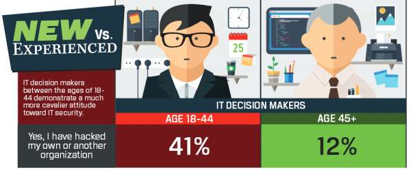 受访者,也就是企业 IT 与安全专家,若考虑年龄,大约在 18-44 岁的 41% 的 IT 专家存在侵入自家或其他企业的癖好,而在 45 岁以上的 IT 专家中,存在这种癖好的比例仅有 12%。