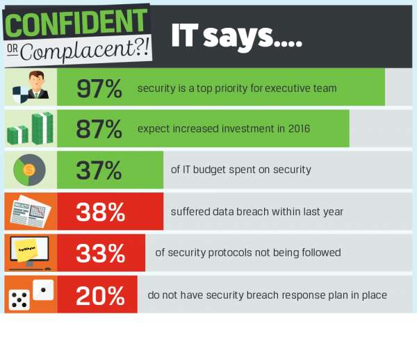 而 IT 专业人员在安全预算上加大投入的原因大概在于,38% 的受访者表示 2015 年期间曾经遭遇过数据外泄,33% 的人则说安全协议没有在企业中进行合理的布局。