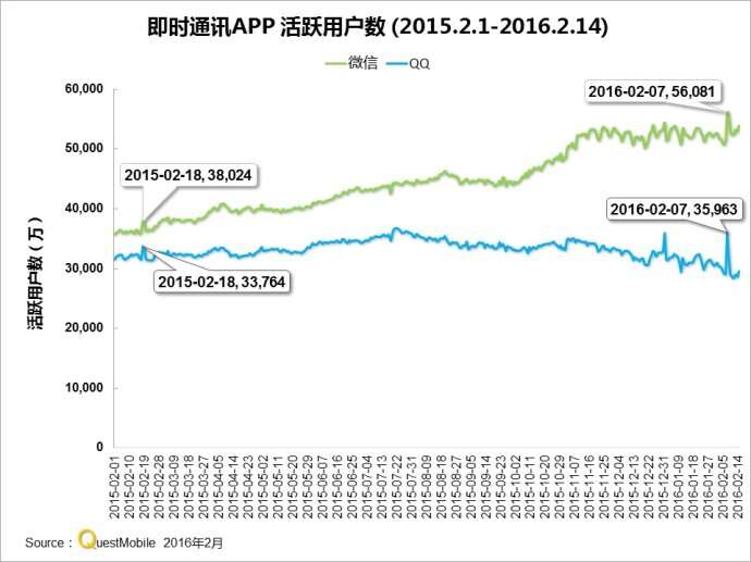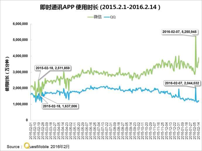 QuestMobile数据显示,春节期间,尤其是大年(非那个人物大年)那天,微信、QQ的日活分别达到了5.6亿、3.6亿,超出平日不少。时长上更是吓人,具体不妨自己看了。