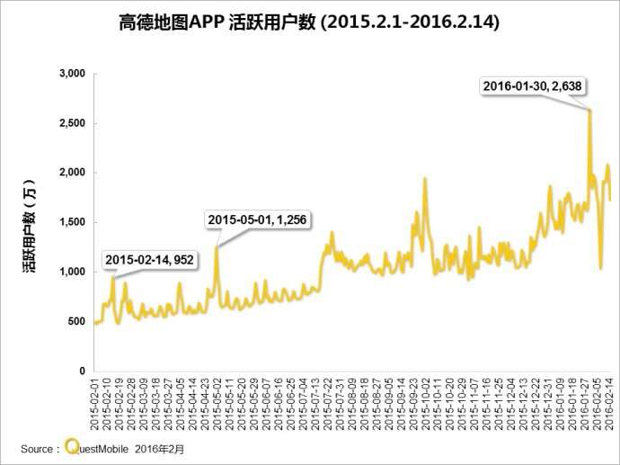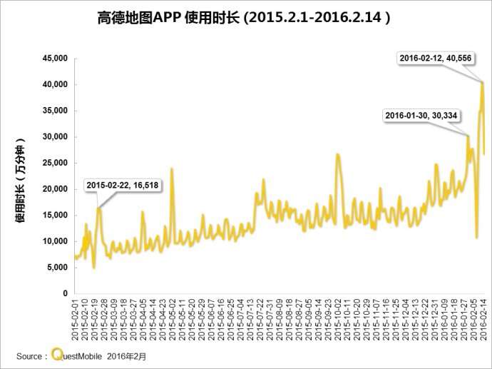 从QuestMobile数据上看,节前一周里,高德地图出现了较大幅度增长,看看这如同A股K线图的表现,有木有很激动?盘中一度上摸2638万,随后也维持在高位,后市可期啊!这在用户时长上表现的更为明显,列位不妨自己看咯!