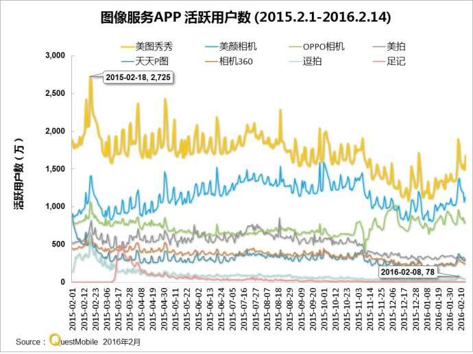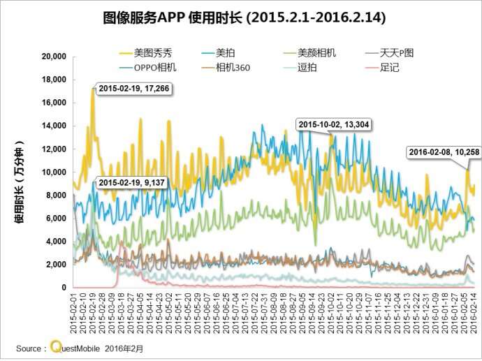 哈哈,开玩笑的了,实际上,整个行当在春节期间,整体趋势还是上升的比较明显,活跃用户上,美图秀秀、美颜相机、OPPO相机都有很高表现,使用时长上,美图秀秀表现很高,不过还是不如去年,看来今年加班积极性不如去年。