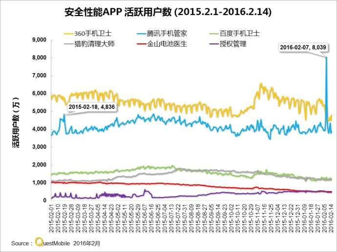 QuestMobile数据显示,日活跃用户表现上,腾讯手机管家突破8000万,创下全行业的历史记录,从图上看,360就像被刺刀深深扎了个大窟窿穿透了……看来抢红包还是安全第一啊!