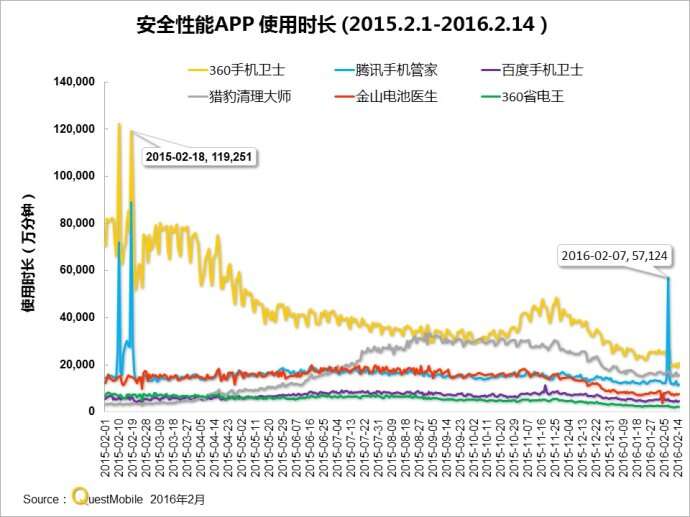 从时长上看,去年春节期间,360与腾讯手机管家都发力了,今年则只有腾讯手机管家发力,同样也是一飞冲天。