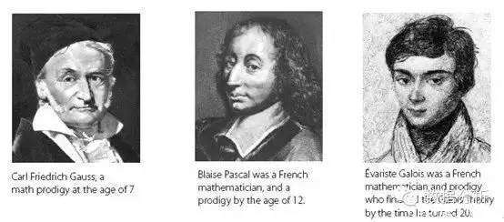 由于数学本身是一个自致、独立的世界,数学神童们能够很早就显示出天赋。帕斯卡曾在12岁时推理出欧几里得的23条命题,当时他的父母希望他专心研究宗教,但是他们终于做出让步,给了他一本欧几里得的《几何原本》(Euclid’s Elements)。伽罗瓦在20岁时的一次重大决斗前写下了伽罗瓦理论的要点,成为传奇。在现代社会中,诺伯特·维纳(Norbert Weiner)在11岁进入塔夫斯大学;普林斯顿的查尔斯·普费弗曼(Charles Pfefferman)在22岁成为美国历史上最年轻的教授;希伯来大学的露丝劳伦斯(Ruth Lawrence)在9岁时在数学理论考试中达到A,两年后成为牛津大学最年轻的学生。