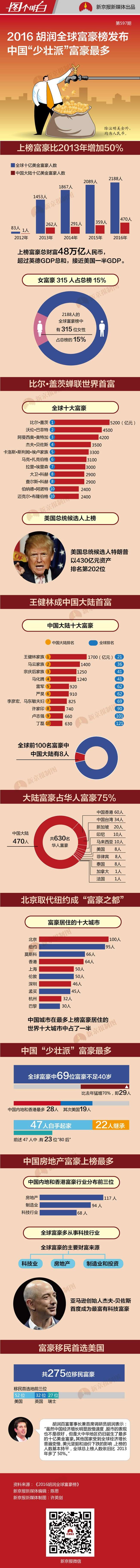 图解:2016胡润全球富豪榜–信息图 更多阅读:2013年胡润全球富豪榜2016胡润套现富豪榜Wealth-X&BI:2016年全球富豪榜Top50胡润研究院:2025年张一鸣财富增长76%至4350亿元 成为中国首富胡润研究院:2025年全球十亿美金企业家达3442位 AI领域黄仁勋财富破千亿美元K-12报告:2017-2018全球数字学习现状新财富:2025年500创富榜总市值13.7万亿元,张一鸣4815.7亿居首新财富杂志:2025年张一鸣4815.7亿元首登首富胡润研究院:2025年雷军财富2200亿元,增长114%彭博:2025年Q1扎克伯格净资产2120亿美元跃居全球第二胡润:2012年胡润品牌榜 中移动再居首位 腾讯排第7胡润:2016中国富豪品牌报告2019胡润全球白手起家女富豪榜波士顿咨询:2024年全球财富报告Theknotww:2024年全球婚礼报告