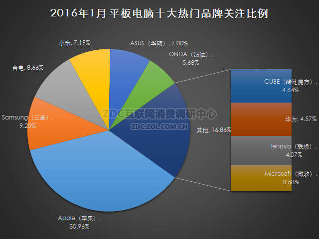 2016年1月中国的平板电脑市场上,苹果以超过三成的市场关注比例在品牌榜独占鳌头,三星和台电排名第二位和第三位,其品牌关注比例分别为9.20%和8.66%;小米、华硕和昂达也分别获得了7.19%、7.00%和5.68%的市场关注比例;其他热门品牌的市场关注度占比都在3.58%-4.64%之间。