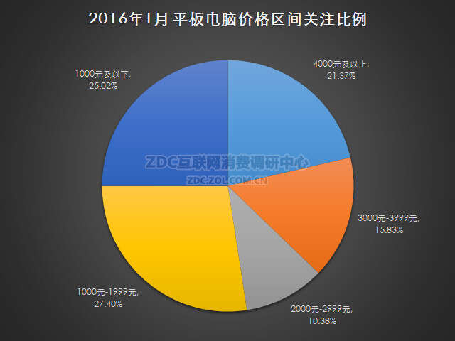 从价格上看,2016年1月中国的平板电脑市场上,1000元-1999元的产品受到最多用户的青睐,市场关注比例为27.40%,价格在1000元及以下的平板电脑关注比例为25.02%;4000元及以上价位的平板电脑市场关注比例为21.37%;3000元-3999元占比15.83%,价格再2000元-2999元的平板电脑市场关注度占比为10.38%。