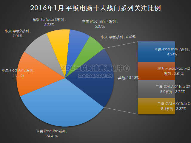 2016年1月中国的平板电脑市场上,苹果品牌榜独占鳌头,收获了三成的市场关注度,三星、台电排名第二、第三;苹果iPad Pro系列关注度上升迅速,苹果iPad Pro(32GB/Wifi版)成为最受欢迎产品;价格方面,中低价位的平板电脑最受消费者的青睐,安卓操作系统关注比例最高;四核心产品为目前市场的主流,32GB内存的市场关注比例最高;近七成用户不关注平板电脑4G/3G功能。