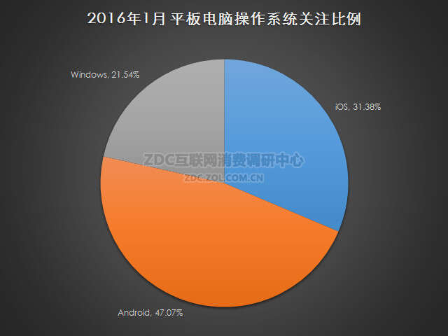 在平板电脑的操作系统方面,2016年1月中国的平板电脑市场上,安卓系统依然是市场关注比例最高的操作系统,其关注比例为47.07%;iOS操作系统的关注比例为31.38%;Windows操作系统的市场关注度占比为21.54%。