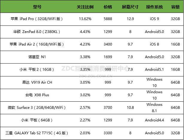 在十大热门产品中,苹果 iPad Pro (32GB/Wifi版)领先优势明显,是关注比例唯一超过10%的平板电脑;华硕 ZenPad 8.0(Z380KL)排名第二,关注比例为4.43%;苹果 iPad Air2(16GB/Wifi版)紧随其后,以4.23%的关注比例获得第三位;诺基亚 N1的关注比例保持稳定,排名第四位。从整体上看,前十热门产品分别来自苹果、华硕、诺基亚、小米、昂达、台电、微软和三星旗下,其中,苹果和小米各有两款产品上榜,其他品牌的上榜产品都为1款。