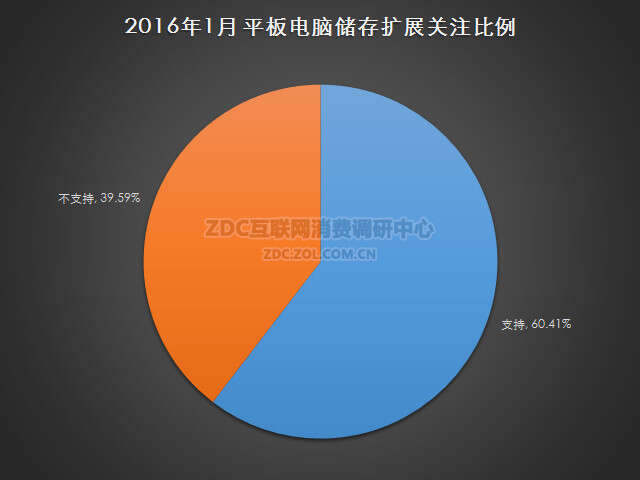 在储存扩展方面,2016年1月中国的平板电脑市场上,支持储存扩展的平板电脑市场关注比例达到了60.41%,不支持储存扩展的产品市场关注比例为39.59%。