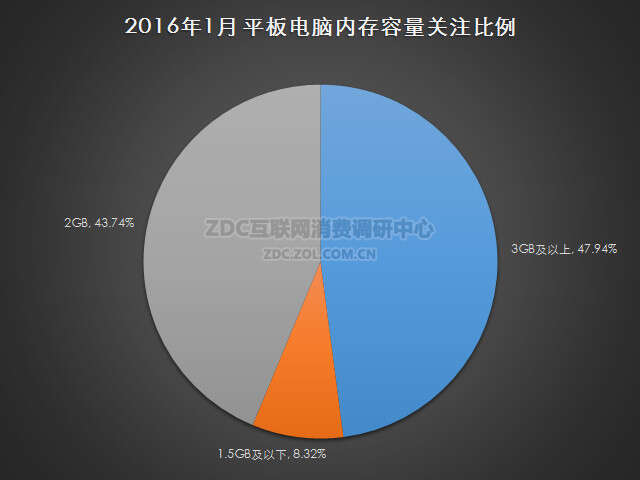 在内存容量方面,2016年1月中国的平板电脑市场上,内存容量为2GB的产品最受用户的青睐,市场关注度占比为43.74%;容量在3GB及以上的产品市场关注比例为47.94%;容量在1.5GB及以下的平板电脑市场关注比例为8.32%。