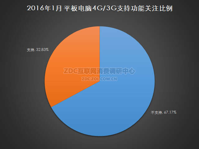 2016年1月中国的平板电脑市场上,支持4G/3G功能的产品市场关注比例为32.83%,不支持4G/3G功能的平板电脑市场关注比例为67.17%。