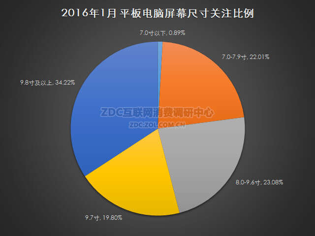 在屏幕尺寸方面,2016年1月中国的平板电脑市场上,用户的关注度比较分散。其中屏幕尺寸为9.8寸及以上的产品市场关注比例为34.22%;8.0-9.6寸平板电脑的关注比例为23.08%;屏幕尺寸为7.0-7.9寸的产品市场关注比例为22.01%;9.7寸平板电脑的市场关注比例为19.80%;7.0寸以下的平板电脑市场关注度占比为0.89%。