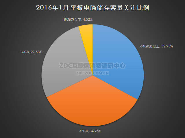 在平板电脑的储存容量方面,2016年1月中国的平板电脑市场上,32GB储存容量的平板电脑市场关注比例最高,达到34.96%;其次是64GB及以上的产品,市场关注比例为32.93%;容量为16GB的平板电脑市场关注比例为27.58%,8GB及以下产品的市场关注度占比为4.52%。