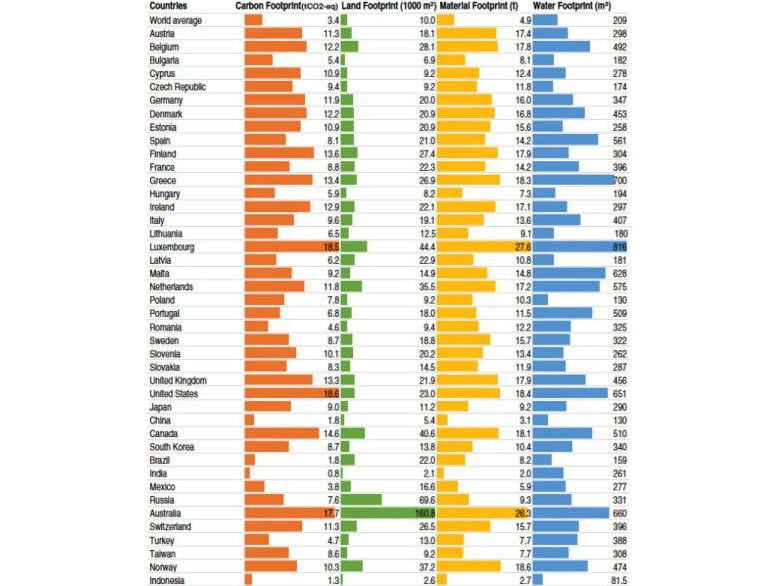 挪威科技大学和荷兰、奥地利、德国、捷克以及丹麦合作创建了一个超大型的详细的数据库,借助此数据库,Ivanova和同事通过观察库中的43个国家、5个地区以及200个产品部门的信息,研究了不同产品或国家是如何影响环境的。下图比较了不同国家对碳排放、土地污染、原料和水使用量的影响。