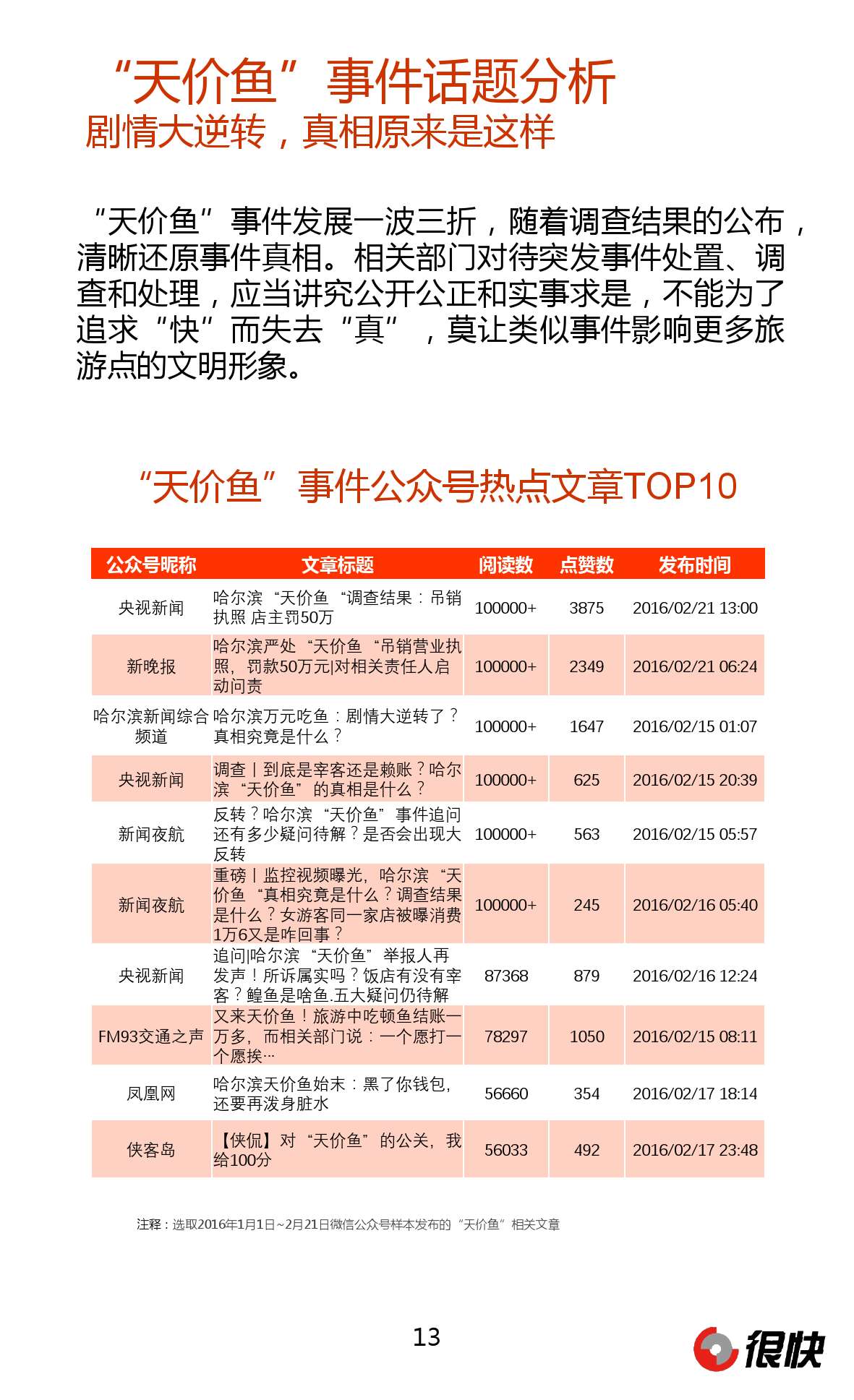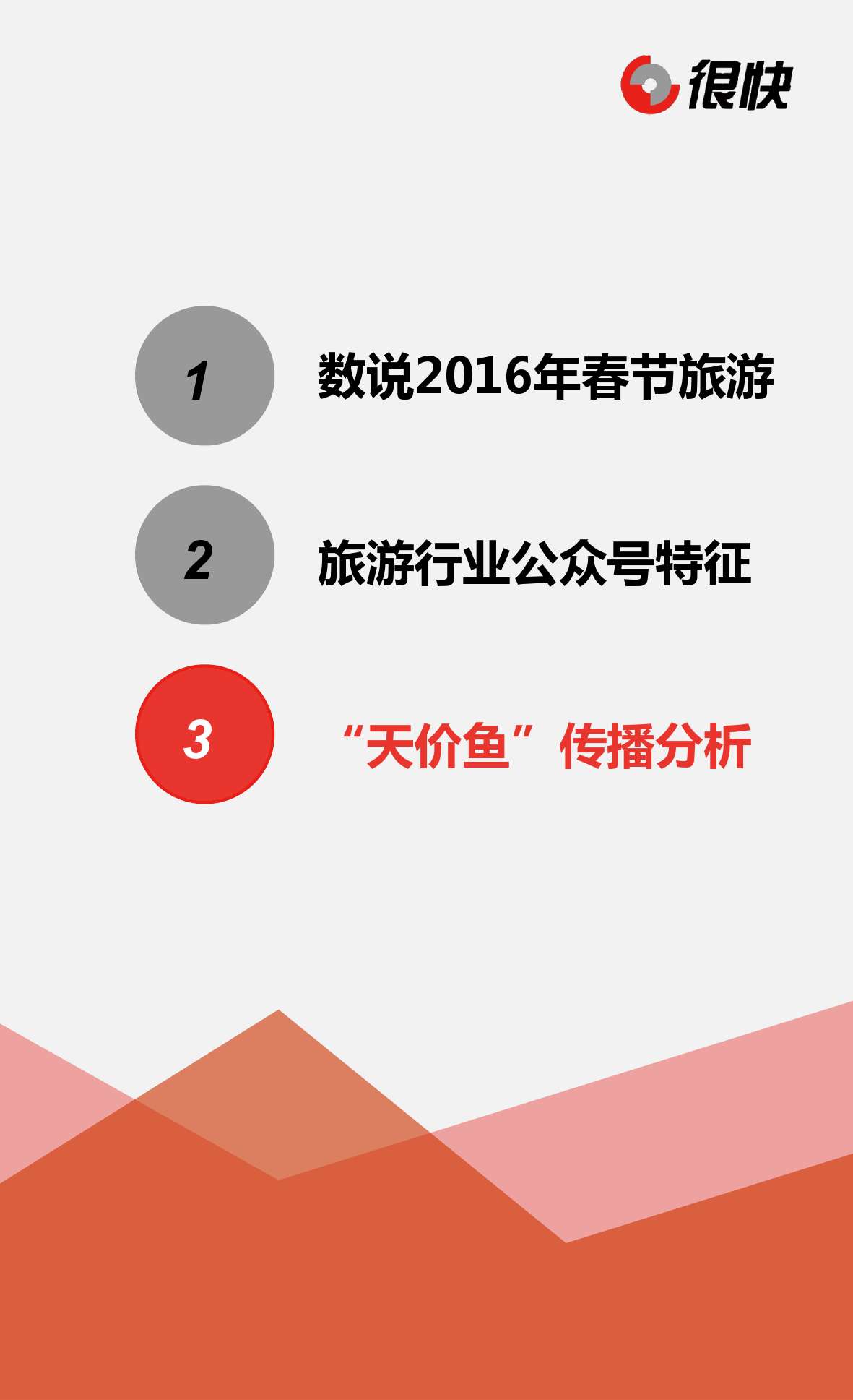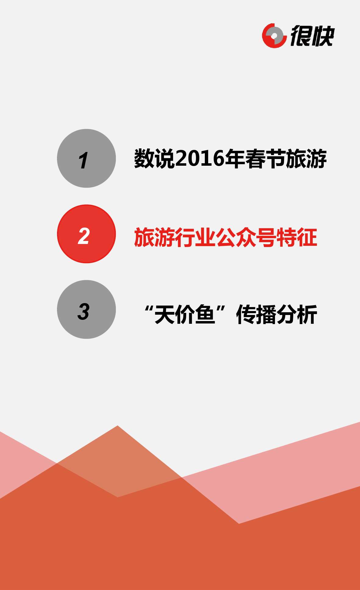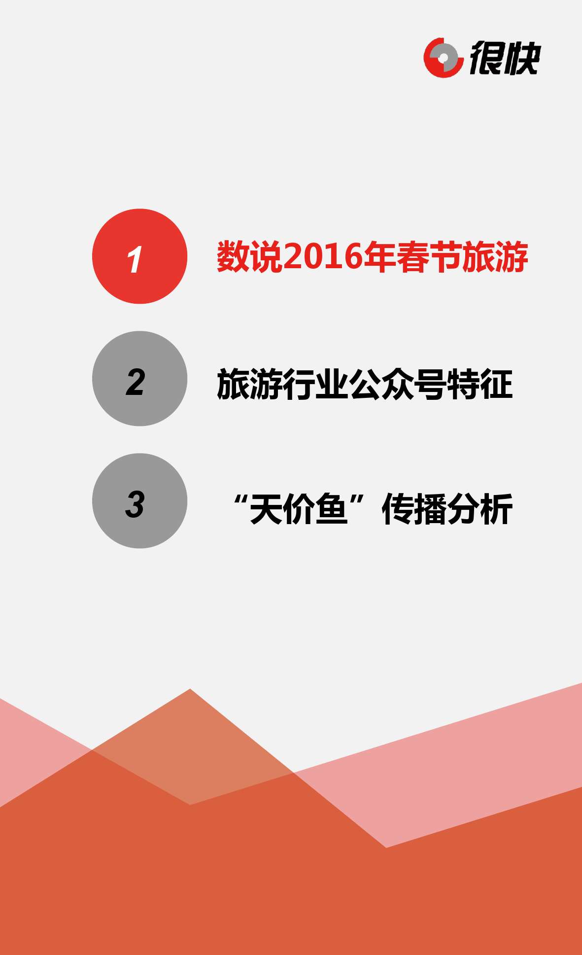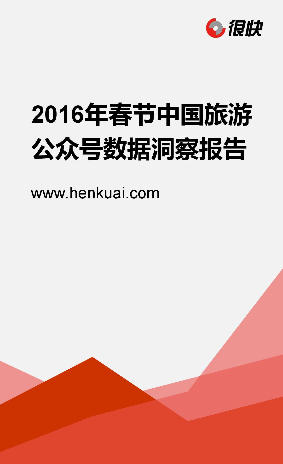 Henkuai:2016年中国春节旅游公众号数据洞察报告 该报告从国内游、出境游两方面解析2016年春节旅游特点和趋势,梳理旅游行业微信公众号基本属性,深入解析旅游行业微信公众号发文特征。旅游行业微信公众号快指数榜把旅游行业类微信大数据尽收眼底,天价鱼”事件公众号传播分析、“天价鱼”事件话题分析、“天价鱼”事件公众号意见领袖分析让用户了解旅游行业公众号的发展状况。 更多阅读:很快:2016年1月中国母婴行业公众号数据洞察Henkuai:2016年中国汽车后市场微信公众号数据洞察报告Henkuai:2016年1月中国医疗健康行业公众号数据洞察Interana:2017年数据洞察状态报告Canalys:2025年第二季度中国PC出货量达到1020万台 同比增长12%Omdia:2025年第三季度中国智能手机市场同比下降3%Niko Partners:2025年中国视频游戏支出507亿美元Canalys:2025年第一季度中国云服务支出同比增长16%Canalys:2025年第一季度中国PC出货量达890万台 同比增长12%GSMA:2025年中国移动经济发展Canalys:2025年第一季度中国大陆智能手机市场同比增长5%奥纬咨询:德国汽车劳动力成本全球最高 车均3300美元Counterpoint:2025年Q1中国智能手机销量同比增长2.5%Dealroom:2025年第一季度中国科技投资报告Canalys:预计2025年中国PC市场将增长3%