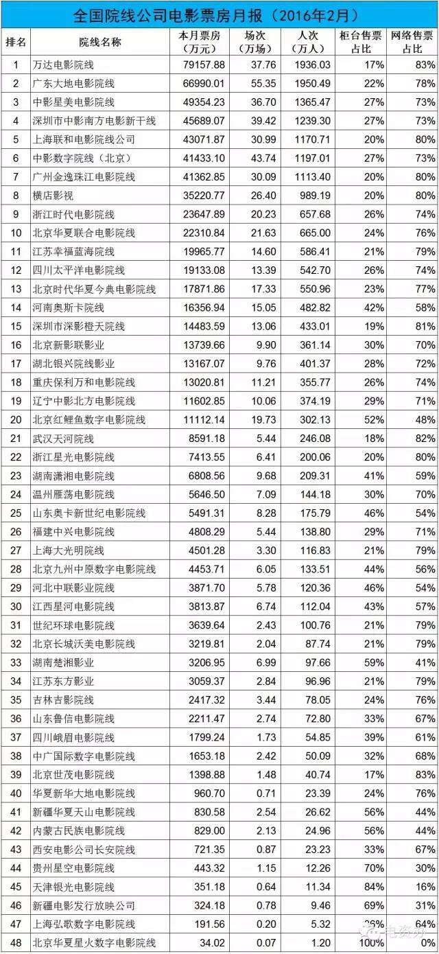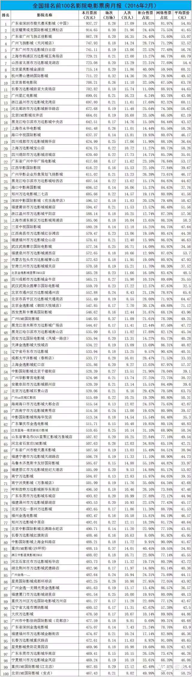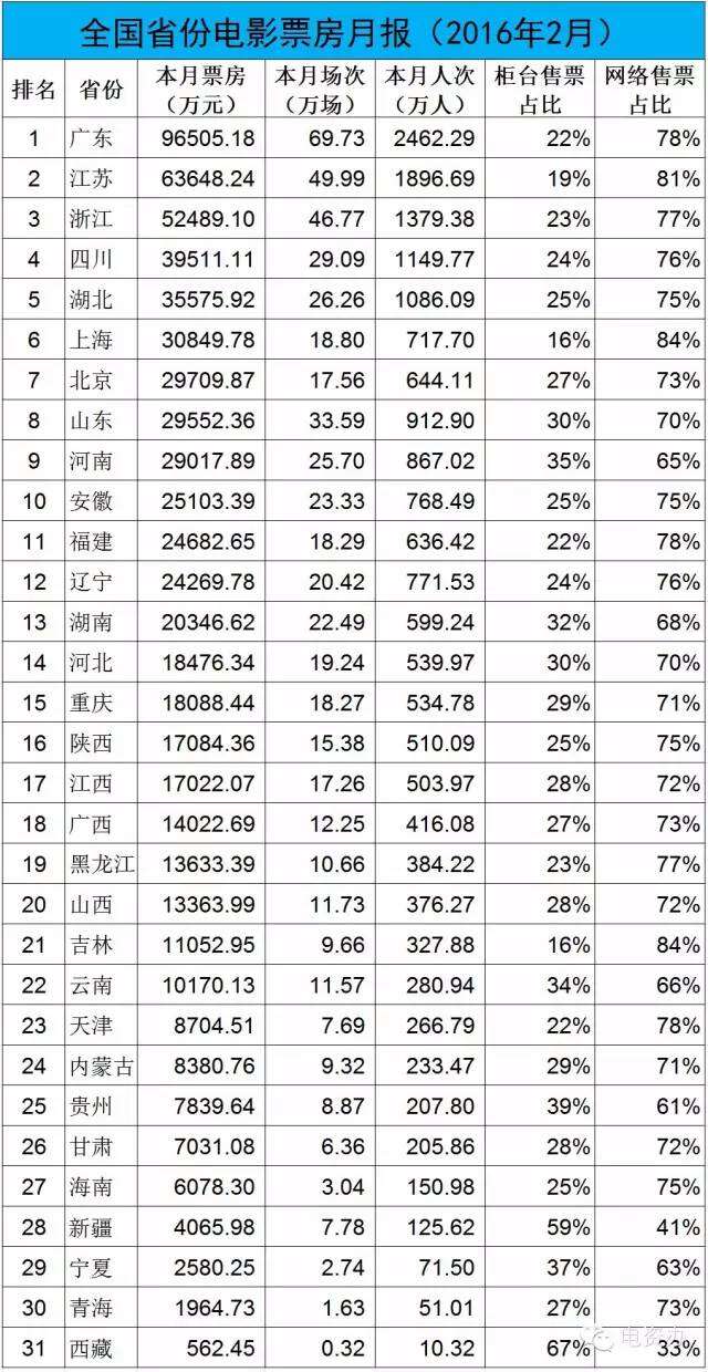 电资办:2016年2月全国电影票房月报 2016年2月全国电影票房月报,依据全国电影票务综合信息管理系统数据整理。 本月全国票房68.13亿元,排场576万场,观影人次1.91亿。 更多阅读:电资办:2018年10月全国电影票房月报电资办:2016年7月全国电影票房月报电资办:2016年3月全国电影票房月报电资办:2024 年 10 月全国电影票房月报电资办:2024年4月全国电影票房月报电资办:2019年2月11-17日全国电影票房周报电资办:2019年1月21-27日全国电影票房周报电资办:2019年11月25日-12月1日全国电影票房周报电资办:2019年10月28日-11月3日全国电影票房周报电资办:2019年11月4-10日全国电影票房周报电资办:2019年9月30日-10日6日全国电影票房周报电资办:2019年10月21-27日全国电影票房周报电资办:2019年7月15-21日全国电影票房周报电资办:2019年2月4-10日全国电影票房周报电资办:2016年11月14-20日全国电影票房周报