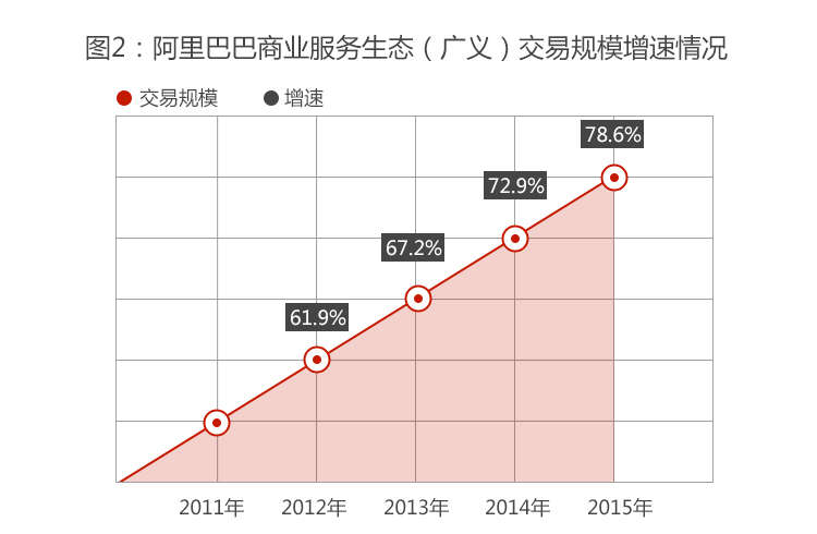 商业服务业具有的B2B行业特性,展示出该行业的稳健性。近年来,基于阿里巴巴相关平台的各类商业服务业(广义阿里巴巴商业服务生态)整体的交易规模保持稳步 增长,增速由2012年的61.9%逐年提升至2015年的78.6%,显示出未来巨大的市场潜力。