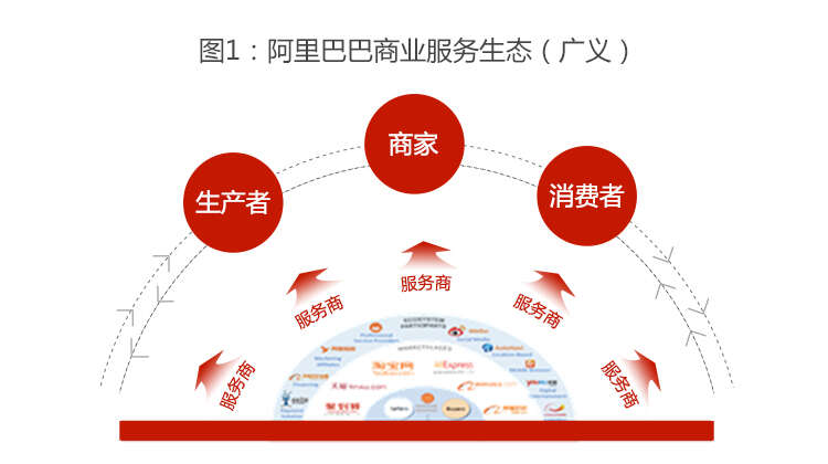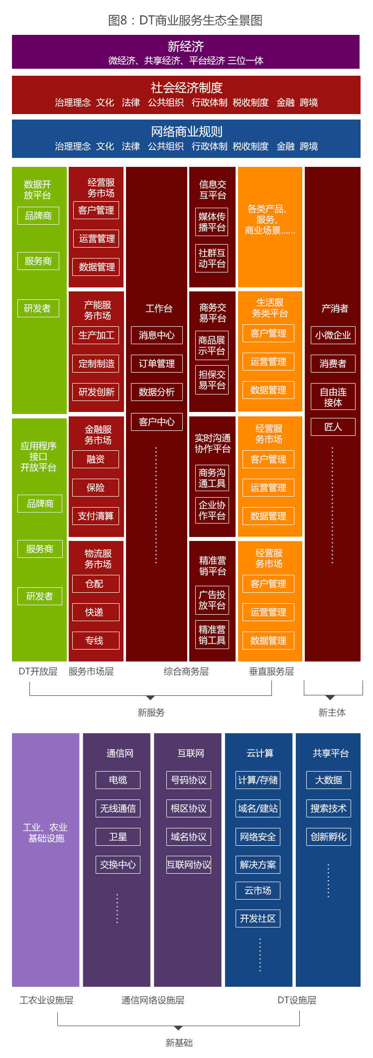 以平台为新商业基础设施,以生产者、商家、消费者为服务对象,众多商业服务机构共享、共建、共生,不断发展、进化生态服务能力,并率先利用全球领先的商业 数据积累,DT时代的商业服务生态全景图逐渐开始浮现。