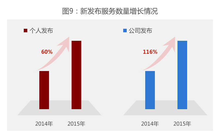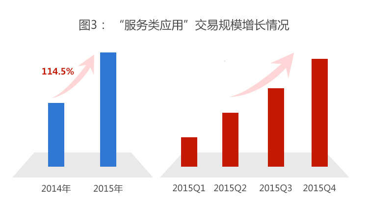 2015年,服务市场 “服务类应用”交易规模增长144.5%,其中客服外包、摄影、咨询服务、招聘、培训、质检品控以及定制类设计等成为新的规模增长点。