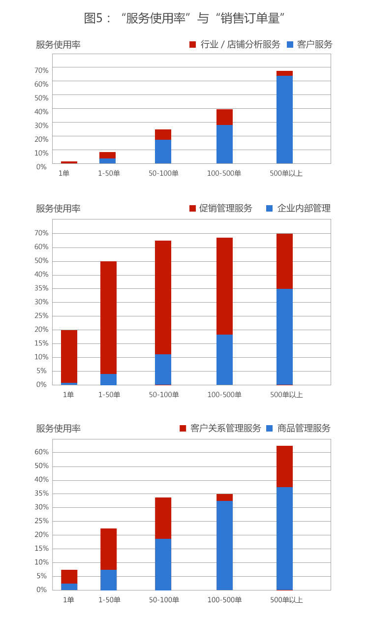 数据显示,商家的“服务使用率”与“销售订单量”之间呈正相关系。其中,促销管理等偏前端服务早期接受率更高。而在行业/店铺分析服务、客户服务、企业内部管 理、客户关系管理等偏后端管理的服务类别,两者的正增长关系明显。