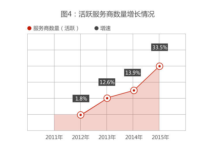 参与阿里巴巴商业生态的活跃服务商数量增速由2012年的1.8%,增长到2015年的33.5%,并保持了加速增长态势。值得注意的是,相对于阿里巴巴商业服务生态(广义)交易规模78.6%的增速、“服务类应用”交易规模144.5%的增速,活跃服务商数量增长率仅有33.5%,一方面,表明市场需求巨大;另一方面,也表示现阶段的优势服务商能够快速抢占市场红利。