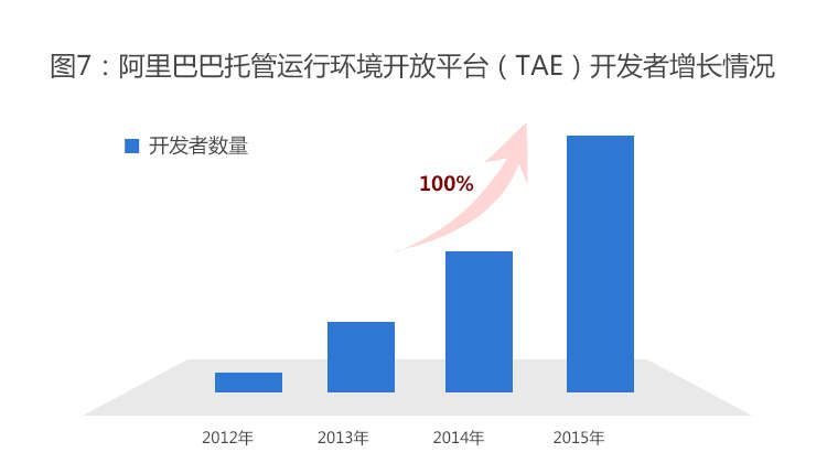 要提供更好的在线商业服务,开发者们需要基于PaaS模型的云计算平台,更需要与电子商务业务紧密结合,并拥有从前端到后端的安全体系,以及全套的开发者工具链。TAE在2012年发布以来,受到了越来越多开发者的喜爱,在2015年,实现了约100%的开发者数量增速。