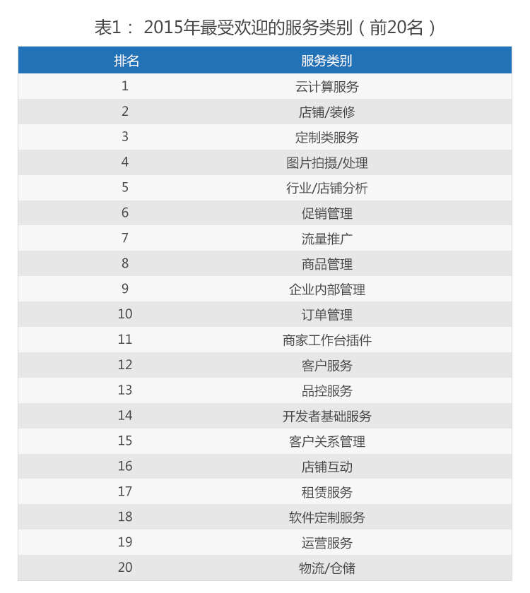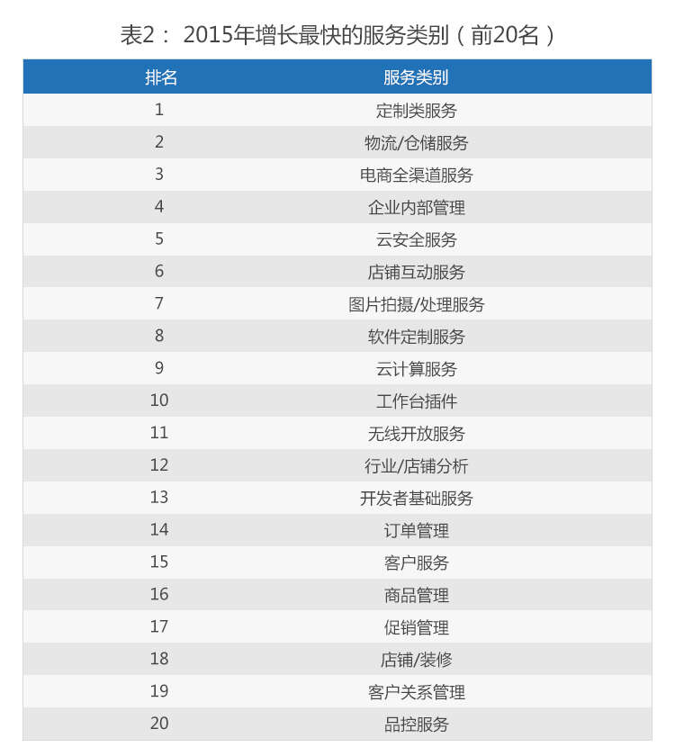 2015年,阿里巴巴商业服务生态中的服务数量连续三年保持加速增长,阿里巴巴服务市场开启了“新业务、新生态”的服务发展方向。