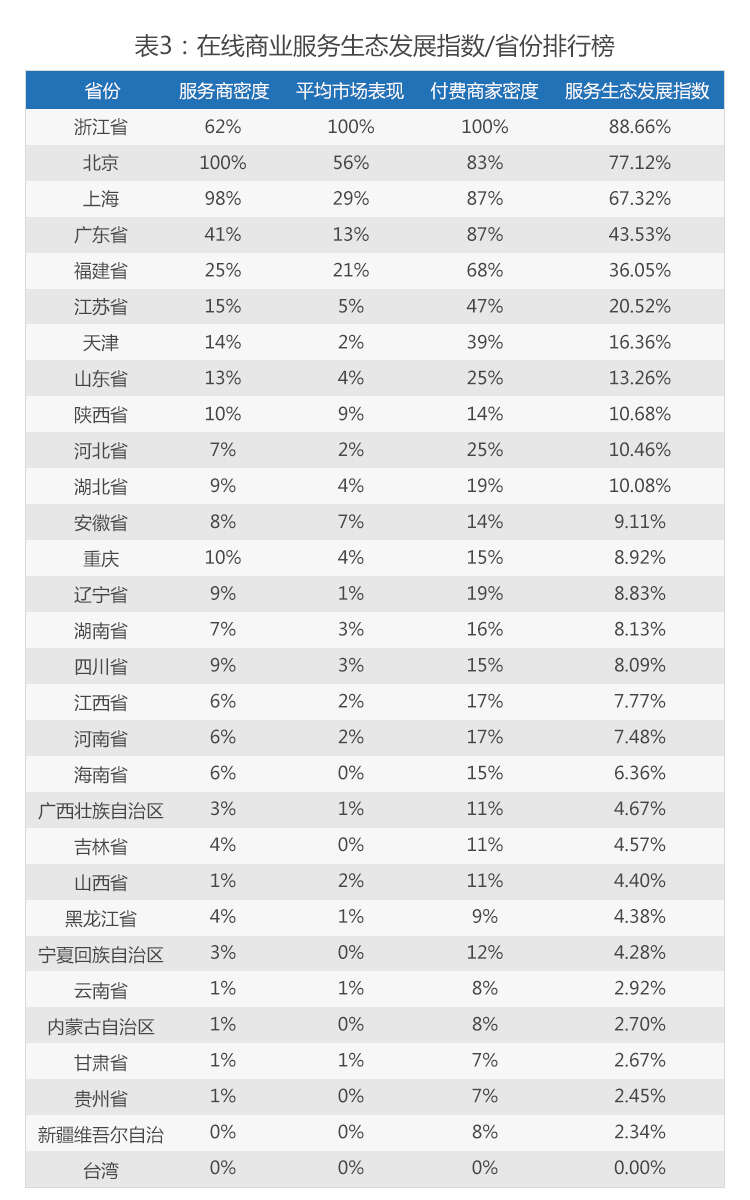 在全国各省中,浙江、北京、上海、广东、福建的在线商业服务生态发展指数名列前茅。其中,广东省的服务商总数最多,北京、上海的服务商密度最高,浙江省平 均单个服务商的市场表现最好。