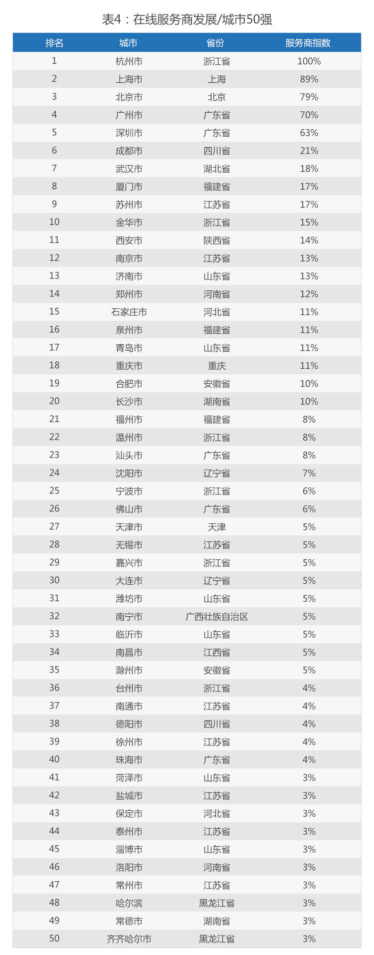 服务商的聚集,能够有效带动当地电子商务、互联网以及相关现代服务业快速发展。杭州及北上广深等城市,占据了服务商生态发展的第一阵营。