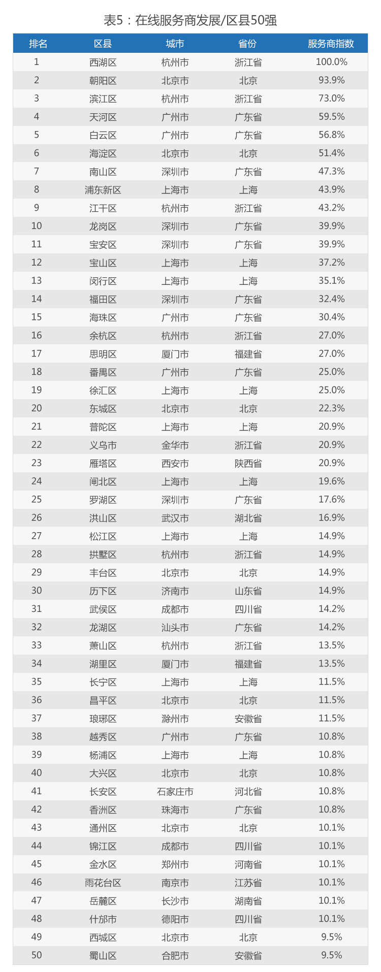 从区县的维度来看,杭州西湖区、滨江区,北京朝阳区、海淀区,广州天河区、白云区,汇聚了最多的服务商,成为区县级排名前六位。