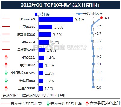 iPhone4S继续领跑产品关注度排行并拉大其优势