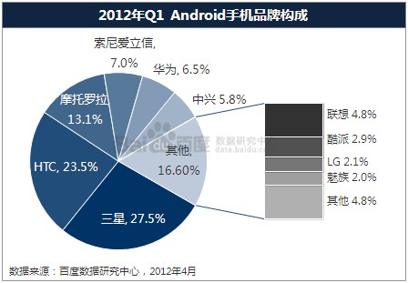 三星、HTC和摩托罗拉瓜分Android手机品牌一半以上的关注度。三星的节节攀升主要归功于其力推的诸多新品智能手机。从畅销的Galaxy S系列旗舰机型面向市场到4G网络中端机型Droid Charge亮相CES等事实表明三星正发力在智能手机市场大展宏图。