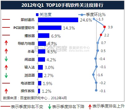 手机软件除了前三名排名相对稳定外,其他都有或多或少的变动。即时通讯以四分之一的关注度比例领先于其他各类软件,紧随其后的是PC端管理软件和播放器,并且后两者在2012Q1都有较明显的增长(增幅都超过2个百分点)。