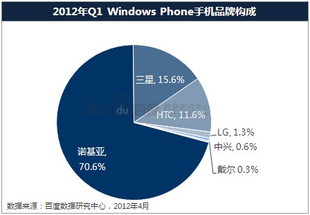 相对Android系统各品牌手机的百花争艳,Windows Phone系统下面的手机显得屈指可数。诺基亚作为微软的战略合作伙伴,以高于70%的份额位于Windows Phone手机品牌第一的位置,其次是三星和HTC(各占一成多)。国内品牌中兴的关注度不到1%。