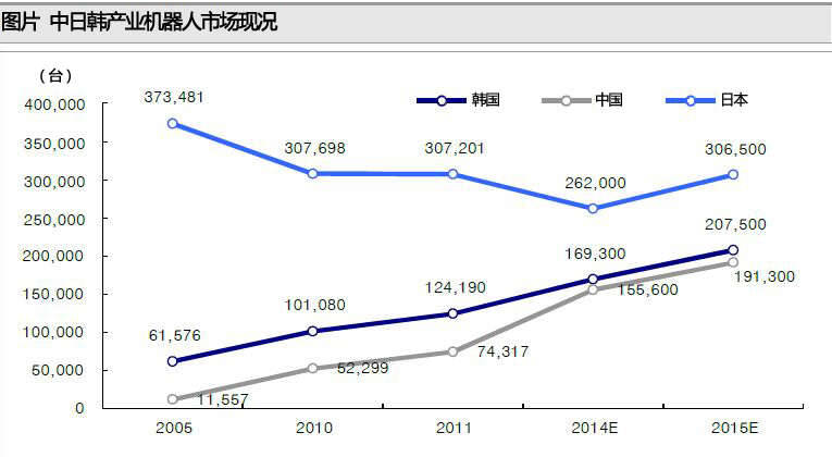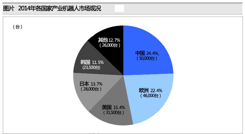 根据IFR (International Federation ofRobotics),从2008年到2013年的5年间,产业用机器人市场CAGR同比增长9.5%,2013年的世界产业用机器人的销售量178,000,95.1亿美元 ,同比增长11.8%YoY,达到历史新高。推定2014年产业用机器人全球市场销售量为20.5万台左右,同比增长15.1%。因为过去5年间的机器人市场的急速成长,因此在主要设备投资方面,预计今后的增长趋势同比过去5年将会迟缓。未来产业与服务用相结合的世界机器人市场(金额标准)从2000年25年间CAGR将增长9.2%,至2025年达到669亿美元。