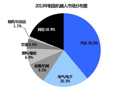 汽车制造业车间里,组装、焊接、涂装、运输乃至到质量检测,无一不需要机器人的协助来完成生产。过去若有机器人替代人力资源成为自动化与只要生产力的概念,现在的机器人将会成为处理在保障创新的品质的前提下,人类做不到的高精密作业。2014年,世界制造用机器人市场规模达到100亿美元左右,增长15.0%YoY。制造用机器人市场到2017年2年间,预计CAGR将以12.0%的速度快速成长,其中汽车制造业占据40%左右。