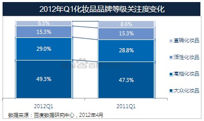 高档化妆品关注度接近30%,直销化妆品关注度比2011年同期有所下降。