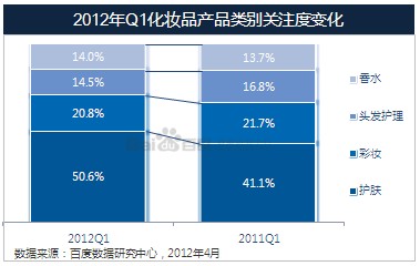 2012年Q1护肤产品类别最受网民关注,占比同比增长9.5%;彩妆关注度占比比去年同期略有下降;头发护理关注度下降,但香水的关注度有所上升。