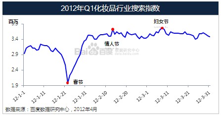 2012年Q1化妆品行业日均搜索指数为335万,情人节前一天达到小高峰373万,妇女节当天达到峰值376万,有关两节的详细分析将会在之后的节日小专题中呈现。