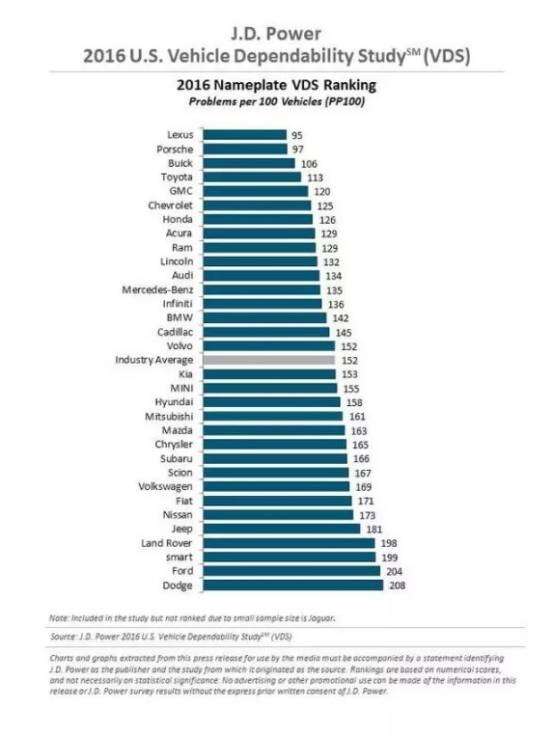 这项排名的主要依据是百车故障率,具体是指购买新车后,通过前3年使用,平均100辆车,发生的问题次数(仅调查一手车主,二手车不在调查范围)。2016年的研究报告是对2013年型号车辆的33560名车主进行了追踪调查后得出来的,共分为八大车系,无论是从样本数量、追踪时间还是评判标准都足够让人信服。