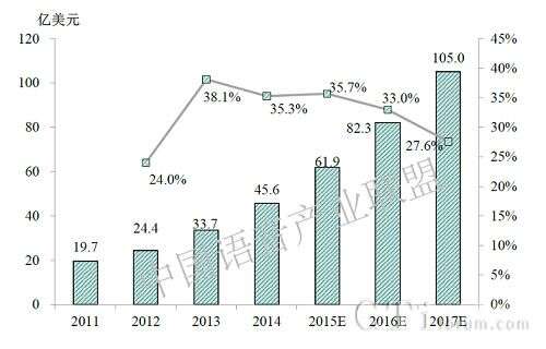 2015年全球智能语音应用需求不断扩大,在各国政府、相关行业及资本界的持续关注之下,智能语音产业得到迅速发展。一方面,美国、日本、欧盟等国家及组织积极布局,通过政策引导推动智能语音关键技术的研究和产业化,并向更广阔和前瞻的人工智能领域拓展。另一方面,语音技术厂商和IT巨头大力布局人工智能领域,带动全球智能语音产业规模进一步提升。据中国语音产业联盟监测数据显示,2014年,全球智能语音市场规模整体达到45.6亿美元,与2013年的33.7亿美元同比增长35.3%。2015年,全球智能语音市场规模预计将达到61.9亿美元,较2014年增长35.7%。