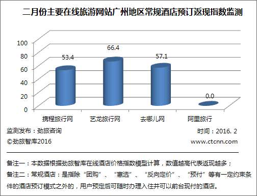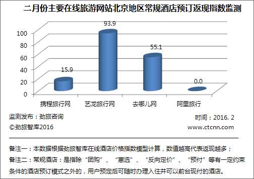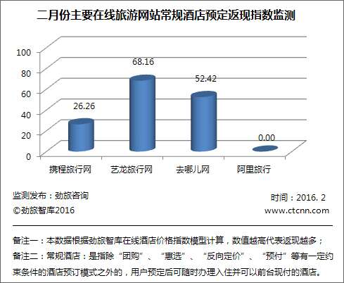 2月艺龙旅行网的在线酒店返现力度依旧最大,返现指数为68.16,与2015年12月相比有所下降,环比下降了10.00%;携程旅行网2月份返现指数为26.26,与去年12月的23.79相比,环比上升了2.47%; 2月份去哪儿网的返现指数为52.42,环比下降了33.99%。根据劲旅监测显示,目前在监测样本范围内,阿里旅行的酒店尚未发现有返现活动开展。
