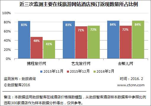 劲旅咨询最新的监测数据显示, 2月份在线旅游网站酒店返现占比与2015年12月份相比有升有降。携程旅行网的2月份在线酒店返现占比与2015年12月相比有所下降,从48%下降到41%;2月去哪儿网的在线酒店返现占比为84%,较去年12月的72%相比上升了12个百分点;艺龙旅行网2月的在线酒店返现占比有所上升,从71%上升到72%。