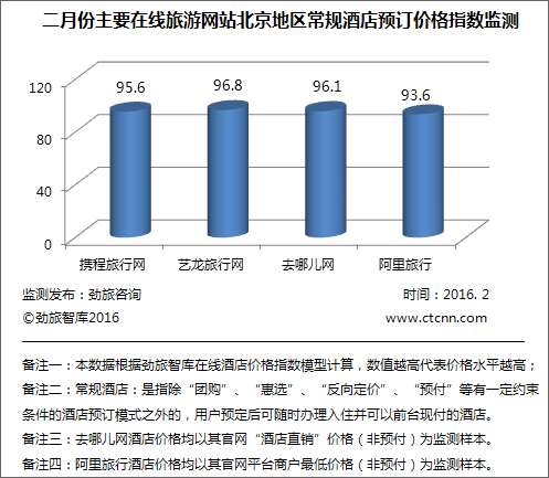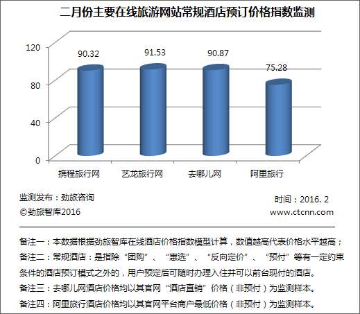 2月,携程、艺龙、去哪儿三家在线旅游网站的常规酒店线上公开价格指数与2015年12月比均有所下降,而本月新加入监测的阿里常规酒店线上公开价格指数为75.28,指数最低,相对占优;携程旅行网2月份酒店价格指数为90.32,与去年12月份相比,环比下降了0.95%;艺龙旅行网2月份酒店价格指数为91.53,相比于去年12月份的酒店价格指数呈上升趋势,环比上升了0.70%;去哪儿网2月份的酒店价格指数为90.87,环比下降了0.57%。