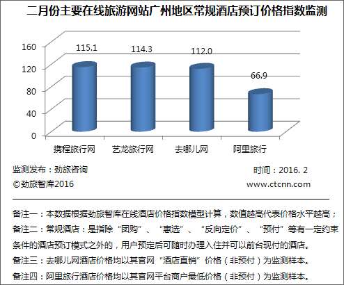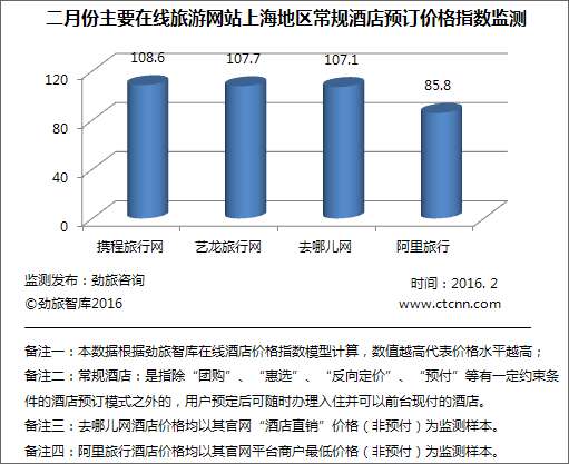 劲旅咨询最新监测显示, 2月份携程、艺龙、去哪儿三家在线旅游网站的酒店公开价格水平相差不大,常规酒店线上公开价格指数与去年12月份相比有升有降,新加入的阿里旅行相对占优;在返现层面上,主要在线旅游网站常规酒店返现指数携程有小幅增加,其他仍处于下降态势。